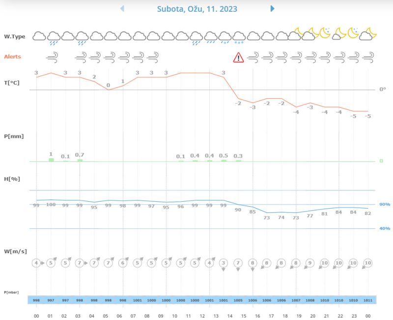 Utorak. Umjereno do pretežno oblačno vrijeme. U večernjim satima kiša u većem dijelu naše zemlje. Vjetar prije podne slab, a poslije podne umjeren do pojačan s jakim udarima, južni i jugozapadni. Jutarnja temperatura zraka od 5 do 11, dnevna od 12 do 18, a u sjevernim područjima Bosne do 22°C.