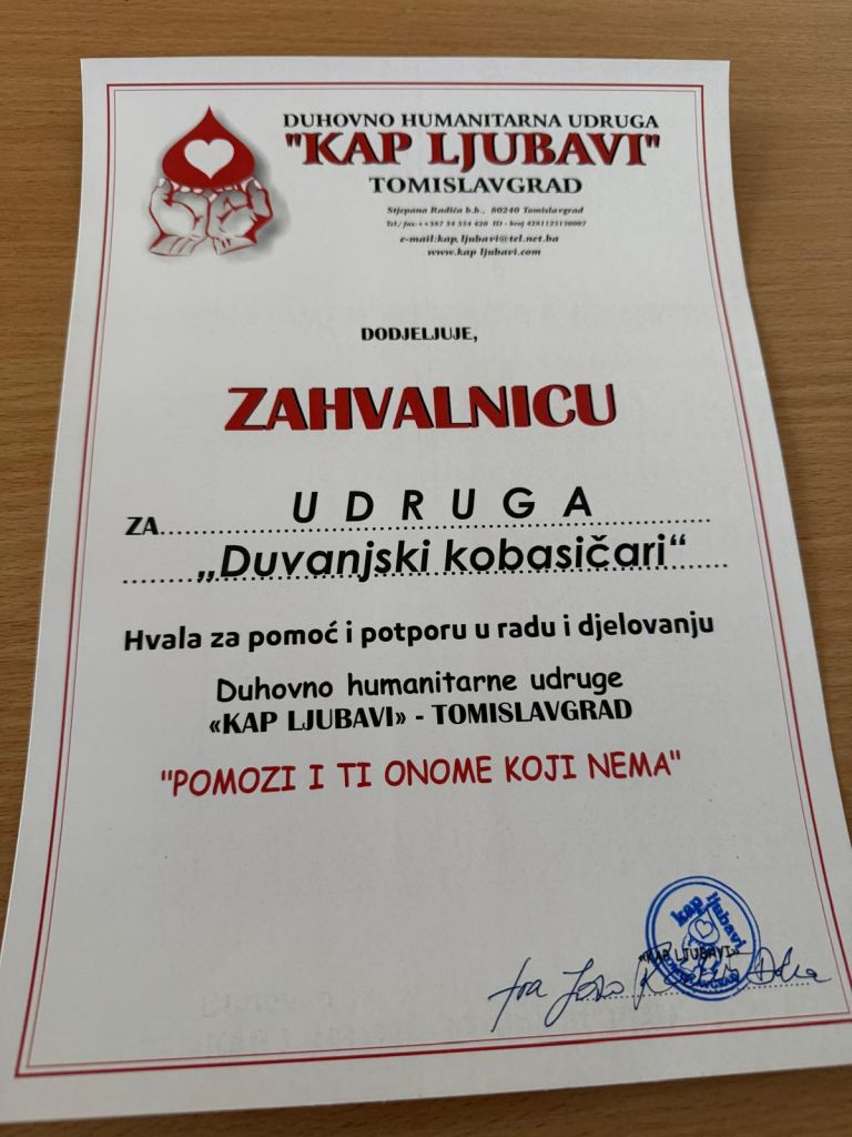 Udruga duvanjskih kobasičara danas je posjetila fra Đoku i Udrugu “Kap ljubavi”, darujući dio sredstava prikupljenih na ovogodišnjoj 6. Međunarodnoj kobasijadi Tomislavgrad.