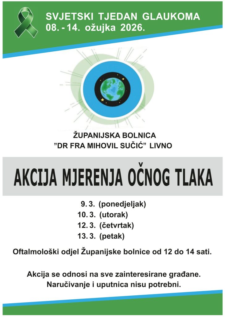 Povodom obilježavanja Svjetskog tjedna glaukoma, koji se ove godine obilježava od 8. do 14. ožujka 2026. godine, Oftalmološki odjel Županijske bolnice „Dr. fra Mihovil Sučić“ Livno organizira akciju besplatnog mjerenja očnog tlaka za sve zainteresirane građane.